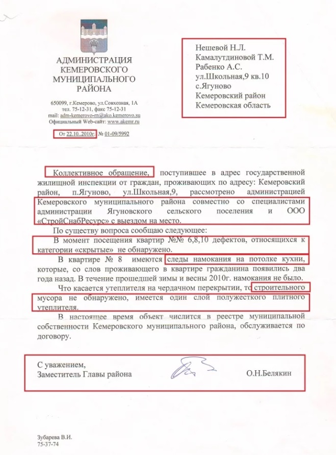Ладно, заселились. Но потом вдруг стали в доме возникать проблемы, то крыша потечет, то стена промерзнет, то трещины по зданию пойдут, поддувает везде. И жители начали писать жалобы. Как мы видим, директор МУП "УКС и МТС" по фамилии Абишев все получил лично. Это январь 2009 года.